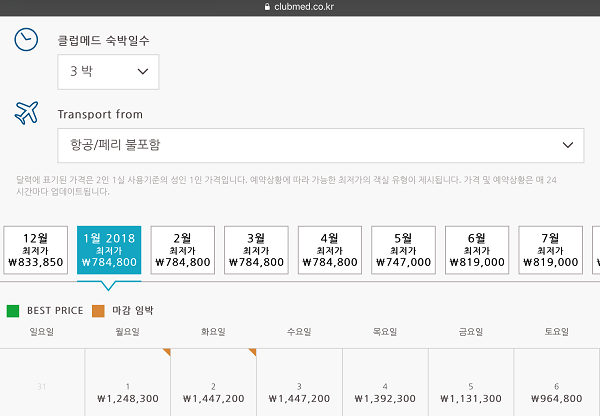 빈탄의 고급리조트에 갔다 왔다는 자랑을 하려고 이런 민망한 글 쓰는 거 아니다. 예약을 하려다가 뜻밖으로 상당히 싸게 이용할 수 있는 방법을 알게 돼서 공유하려는 거다. (한국에서는 대부분 여행사를 통해 비행기표와 함께 예약을 하게 되겠지만) 클럽메드는 기본적으로 홈페이지를 통해 예약을 하게 된다. 그런데 어느 나라 홈페이지에서 예약을 하느냐에 따라 같은 날짜 같은 패키지라도 요금이 천차만별이다.